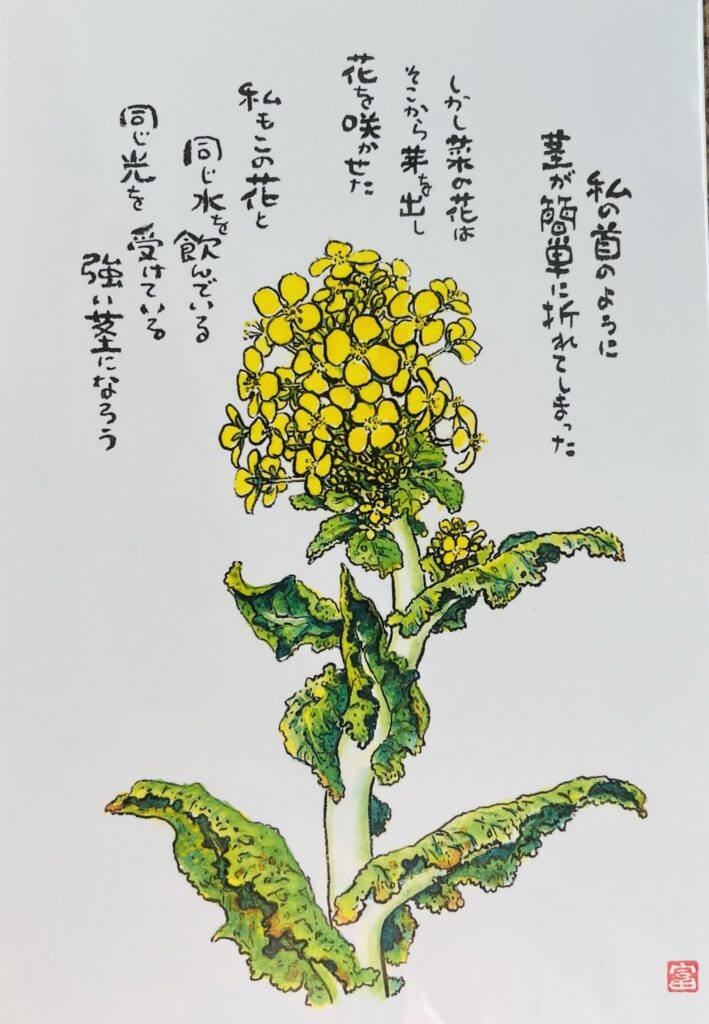 手足が動かないので筆とペンを口でくわえ、入院中にお母さんと二人三脚で、花を描き、詩を書き人生を切り拓いて行く姿に触れることができた。